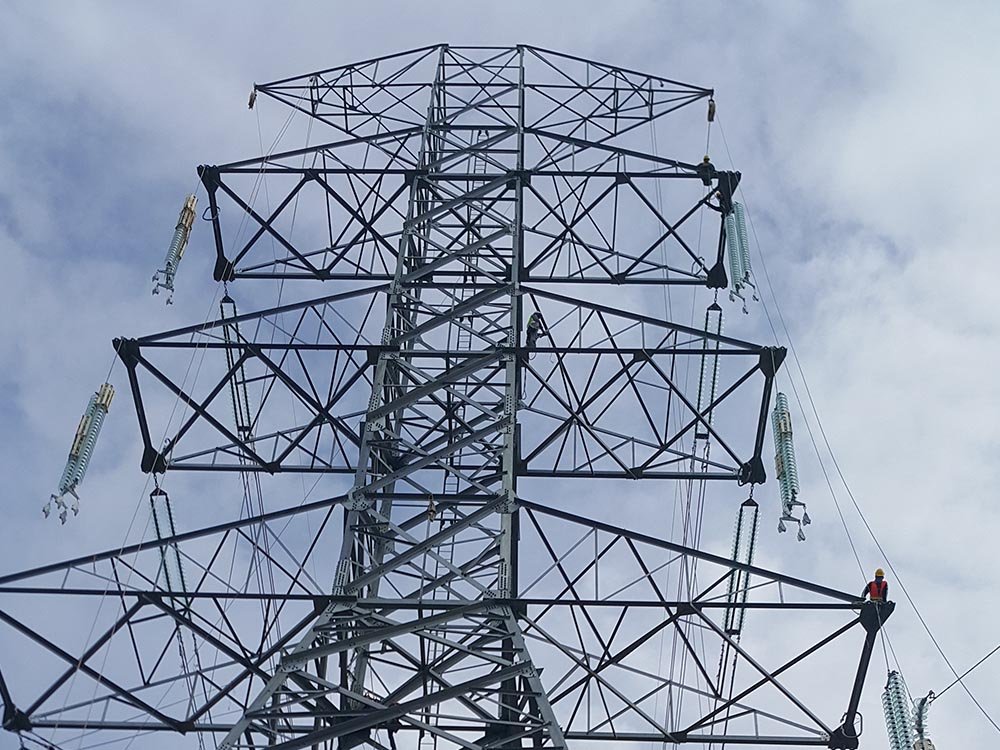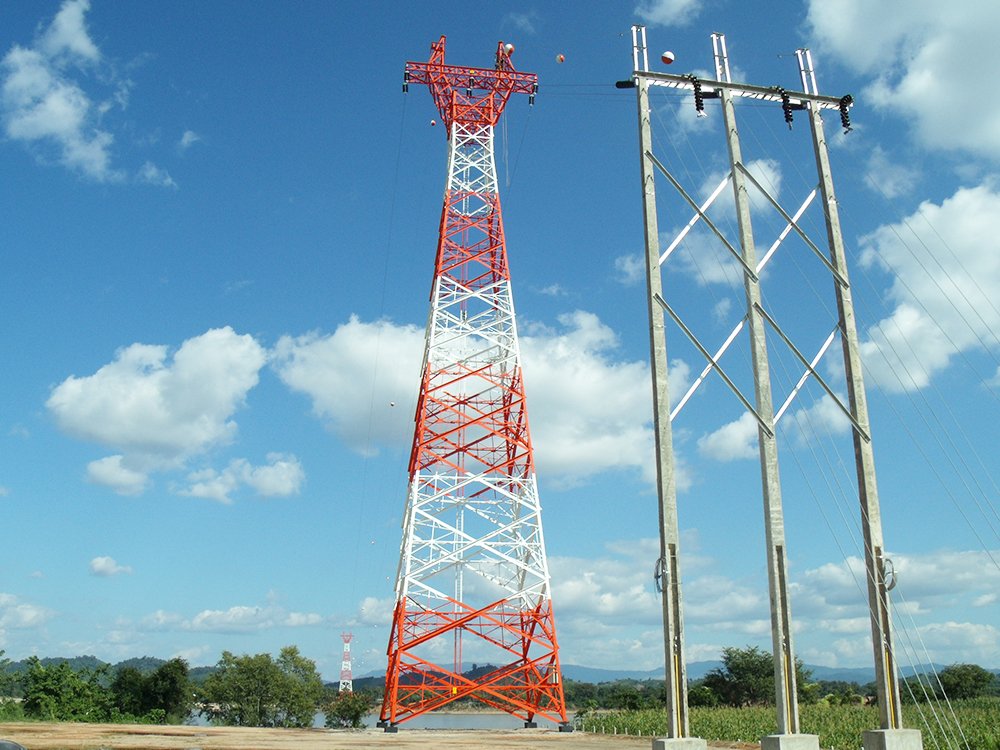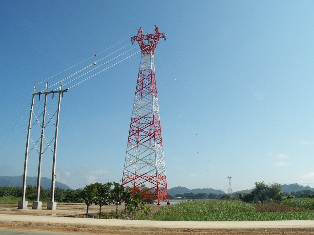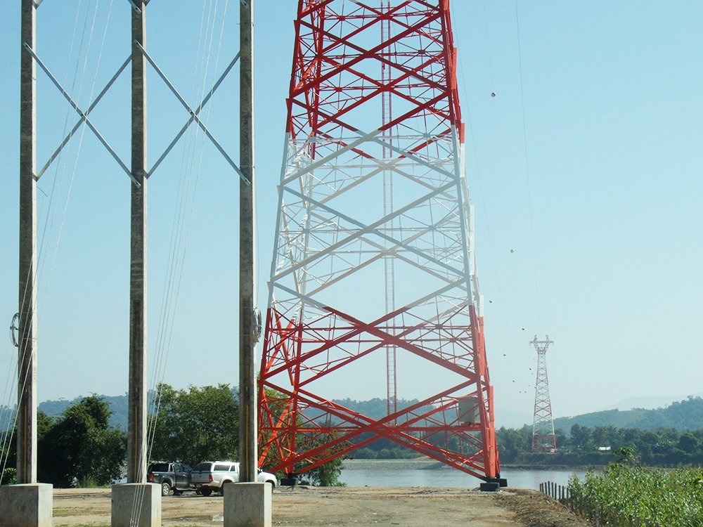 Transmission line tower construction complete wish installation of 22 kv.Distrubution system across the mekong river.