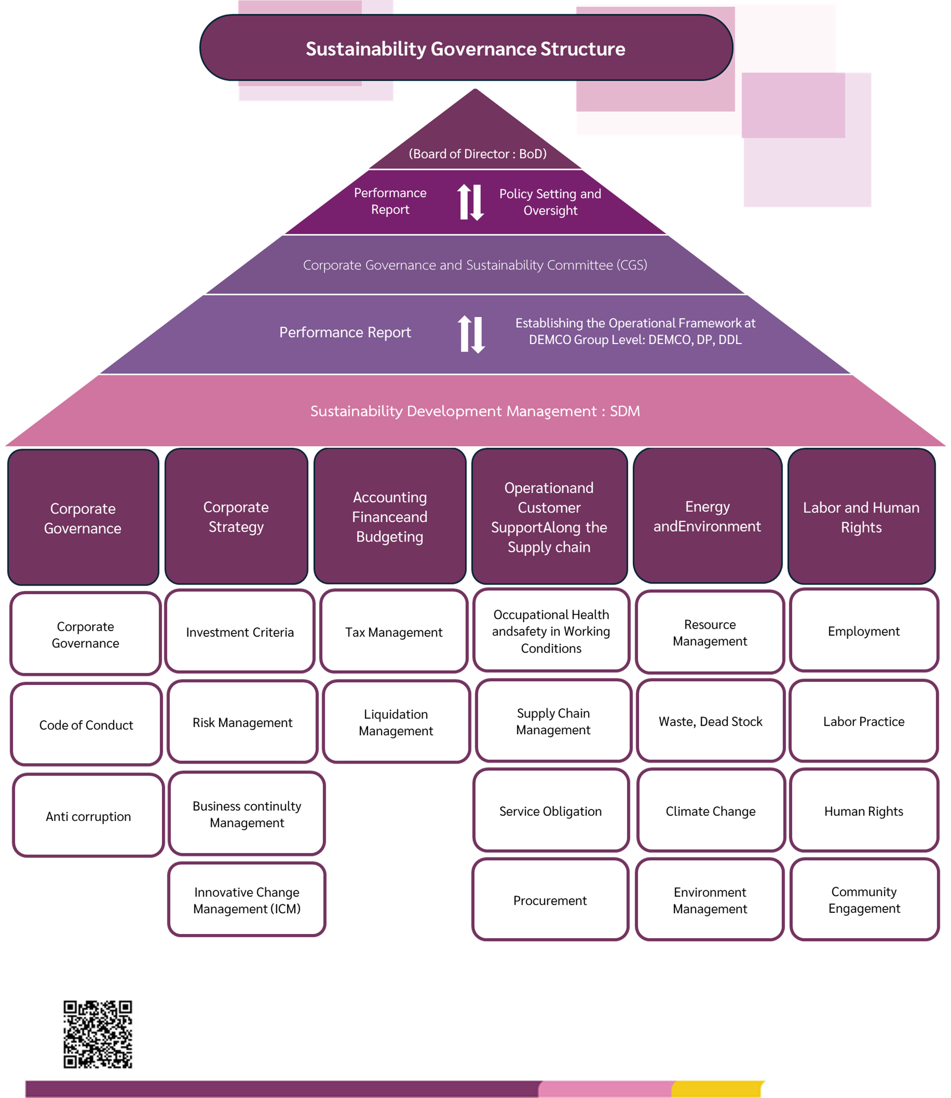 The Company is dedicated to creating shared value across economic, social, and environmental dimensions throughout its value chain. To enhance sustainability development, the Board of Directors has established the Corporate Sustainability Policy to serve as a framework for guiding the business operations of DEMCO Group, both domestically and internationally, as follows: