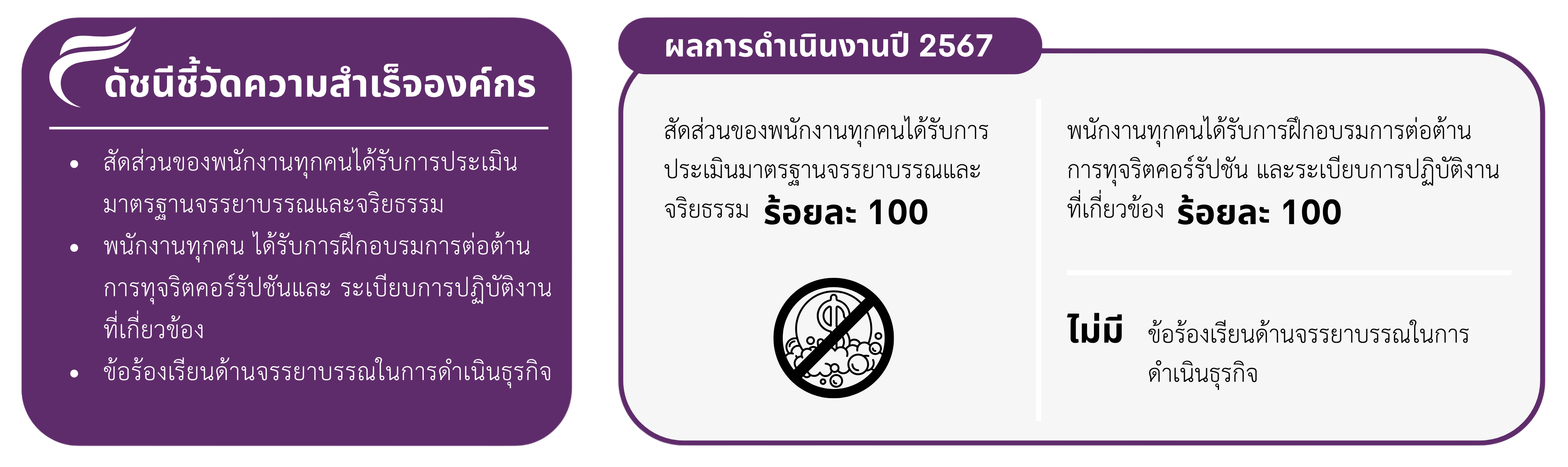 - จัดอบรมเชิงปฏิบัติการเกี่ยวกับจริยธรรม จรรยาบรรณทางธุรกิจ และการต่อต้านการทุจริตคอร์รัปชันแก่พนักงานทุกคน