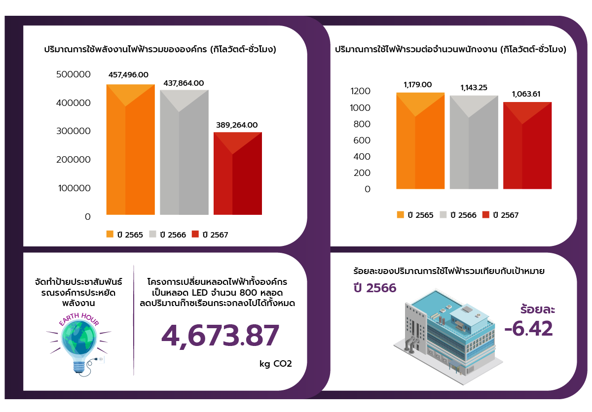 - เปลี่ยนหลอดไฟในสำนักงานปทุมธานีทั้งหมดเป็นหลอด LED ซึ่งมีประสิทธิภาพในการประหยัดพลังงานมากขึ้น