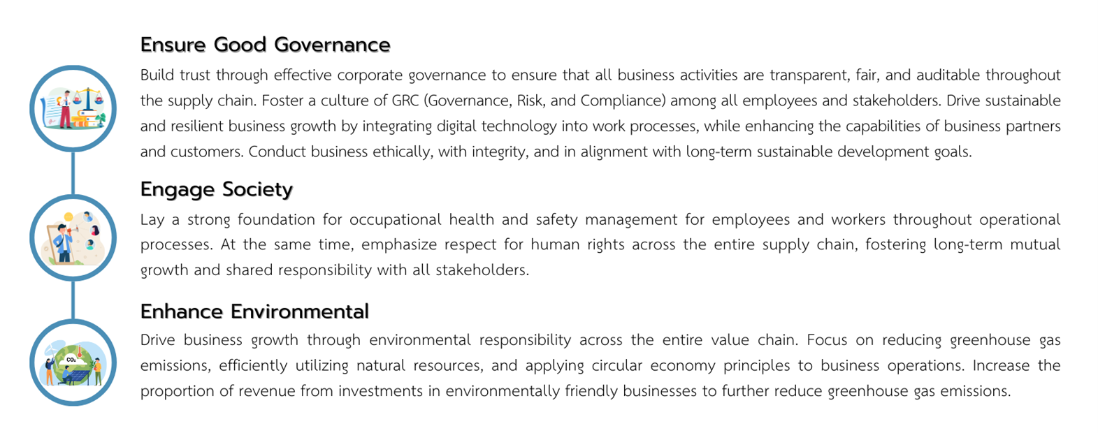 Under the sustainable development framework, the Board of Directors has set a strategic operational direction focusing on business operations and expansion to support the transition towards Smart Energy Service Business. DEMCO has developed its sustainability strategy through a materiality assessment process to address future challenges in alignment with this strategic direction. At the same time, the Company continuously creates shared value for stakeholders (Stakeholder Value Creation) in order to achieve DEMCO’s sustainable development vision—committed to strengthening the organization’s long-term potential through sustainable growth. To this end, DEMCO has defined key sustainability strategies as critical driving forces, including: