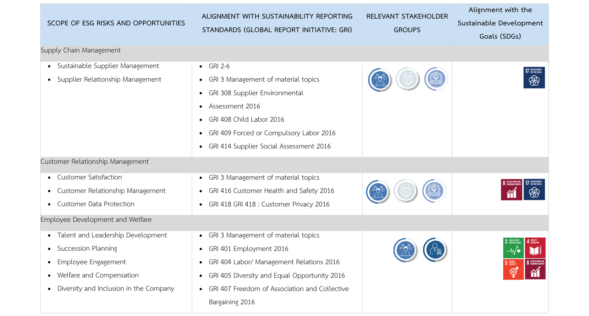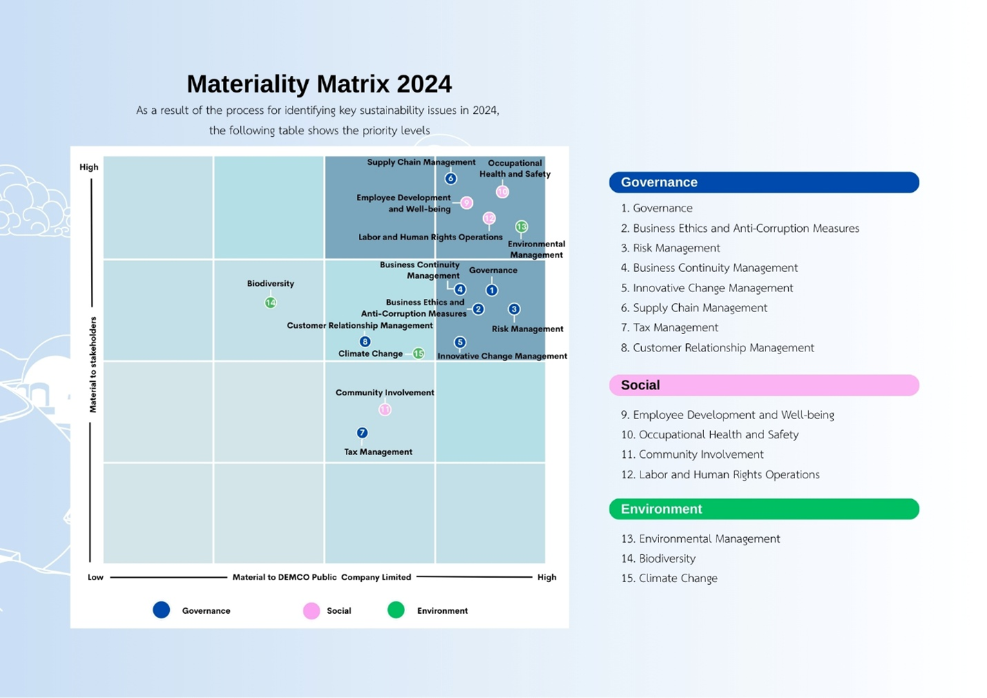 The process followed international sustainability disclosure standards (GRI Standards) and was aligned with the United Nations Sustainable Development Goals (SDGs). Demco regularly reviews and assesses the impact of each material topic on an annual basis. The assessment results serve as key inputs for formulating appropriate sustainability policies and strategies, under the oversight of the Sustainability Development Taskforce.