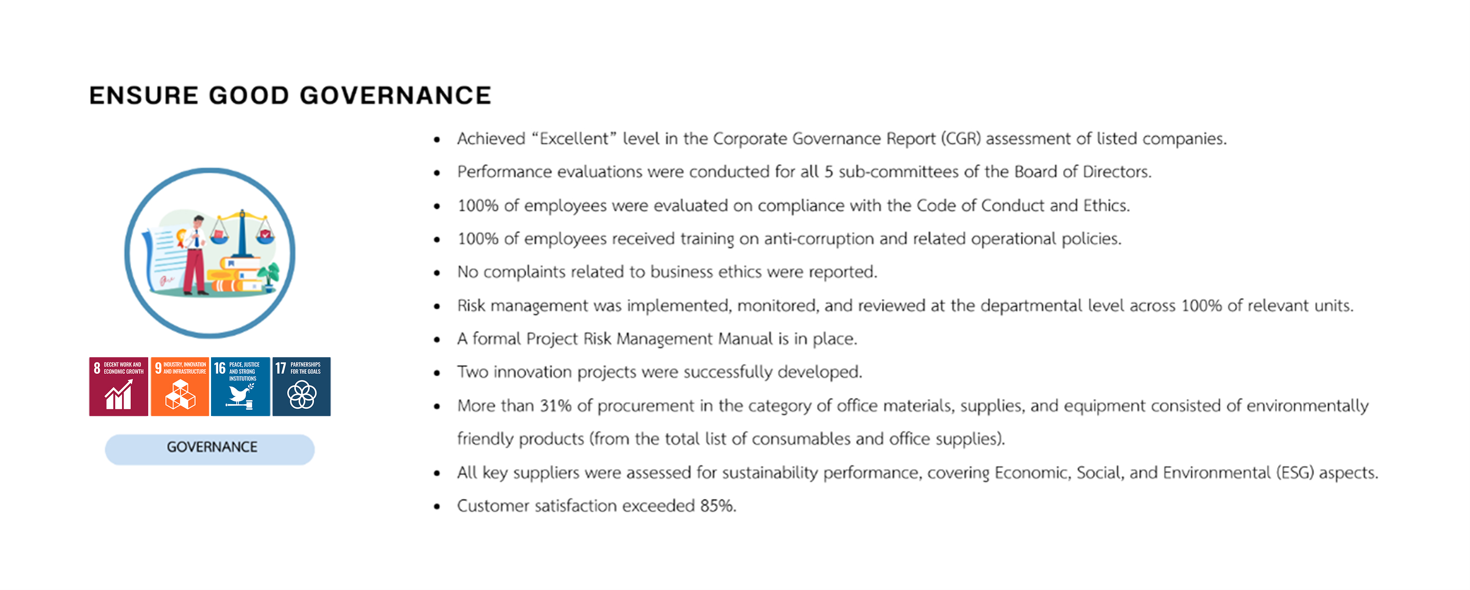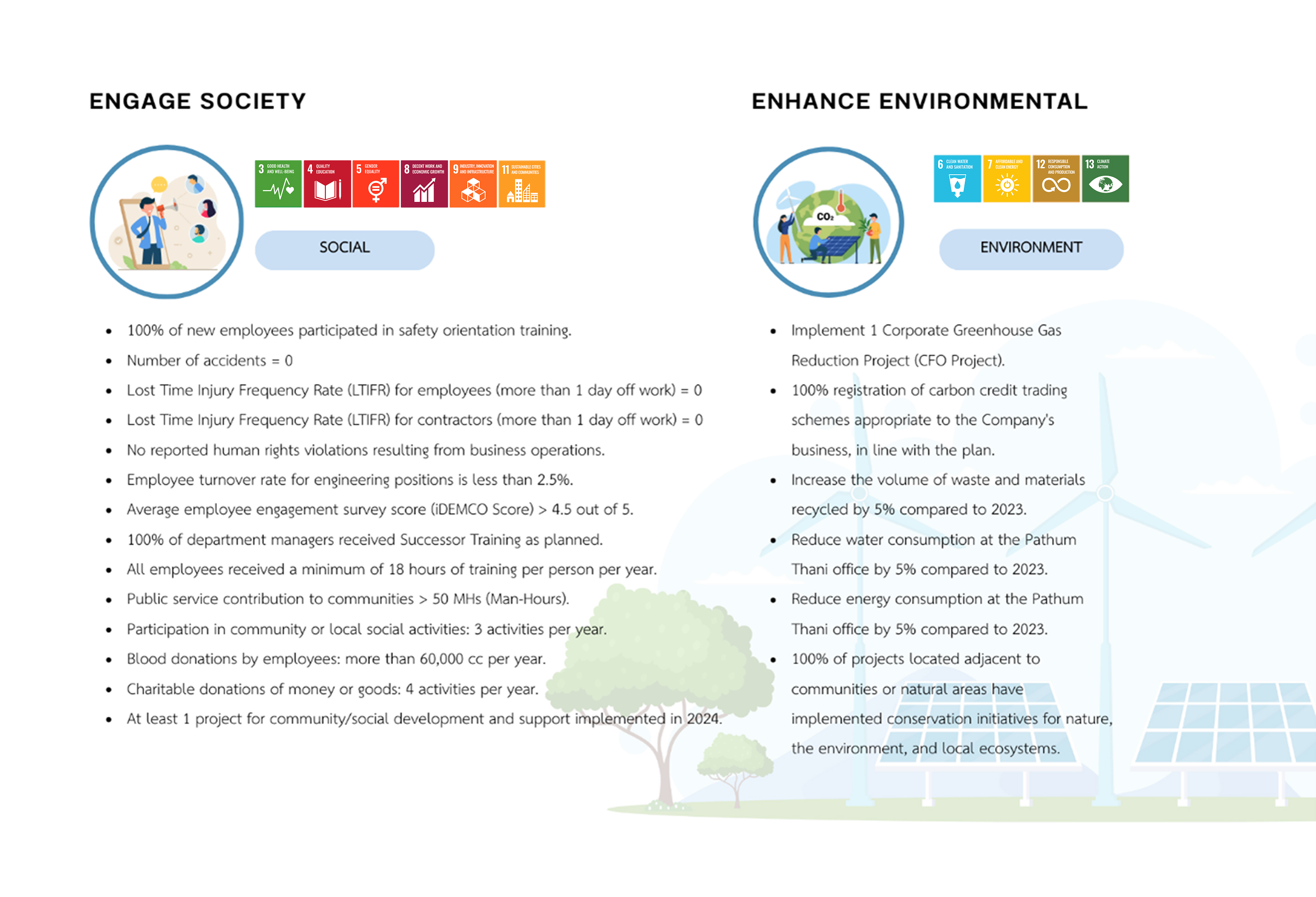 DEMCO is committed to conducting its business based on balanced organizational management, with a focus on strengthening the Company and achieving sustainable growth, while upholding its responsibilities to the economy, society, environment, and good corporate governance. The Company emphasizes sustainable business development to support the achievement of the United Nations Sustainable Development Goals (SDGs).