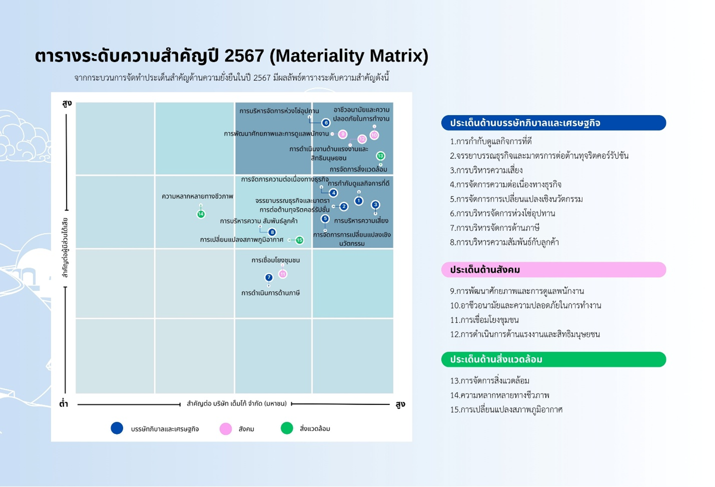 จากกระบวนการจัดทำประเด็นสำคัญด้านความยั่งยืนในปี 256 มีผลลัพธ์ตารางระดับความสำคัญดังนี้
